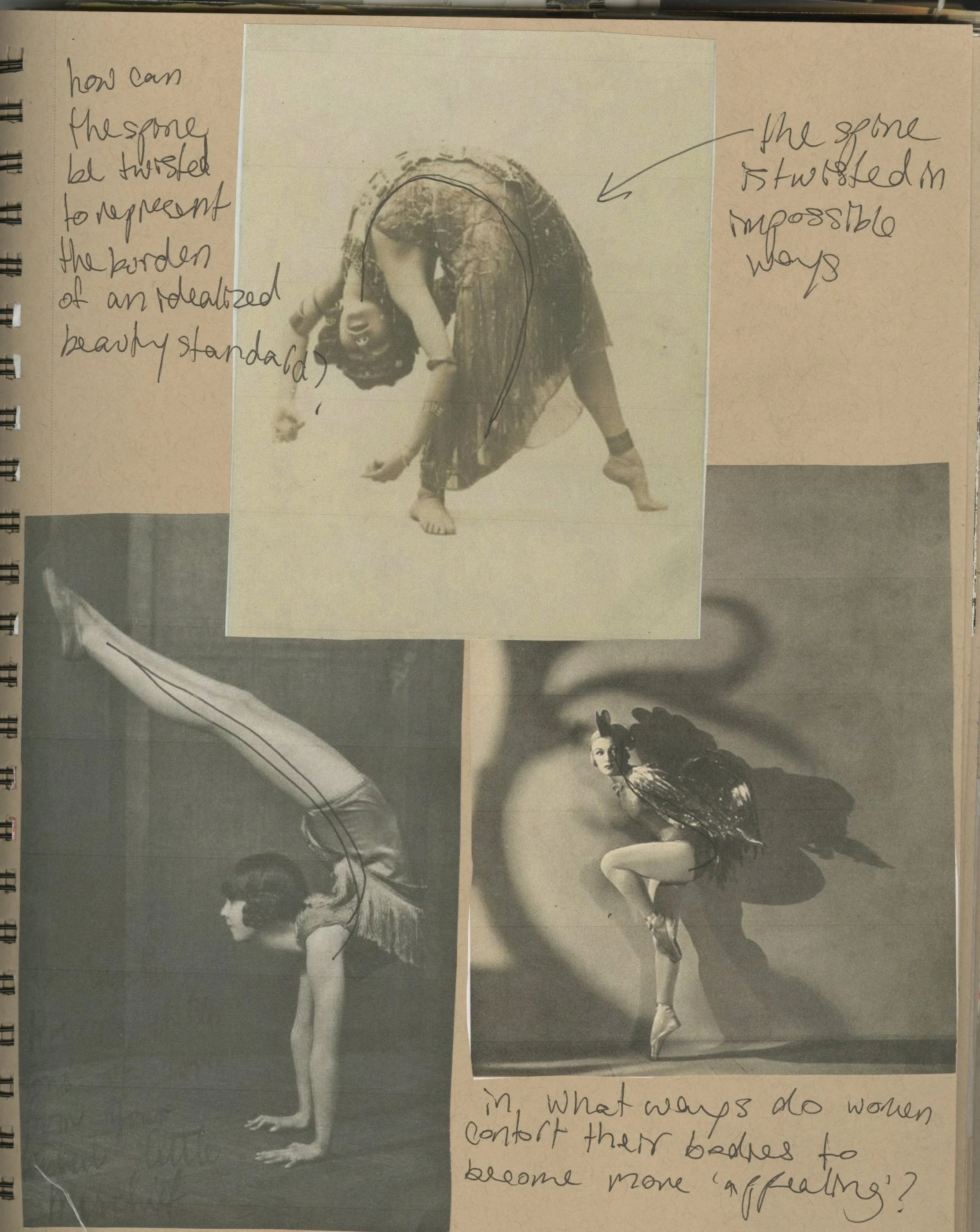 I often center my work around the experience of womanhood. The Return began with an interest in how women relate to their bodies. I began by researching how the body contorts, looking into the bones that form that shape the body itself. I became fascinated by how bones change over time, leading me to explore early theories of human evolution.